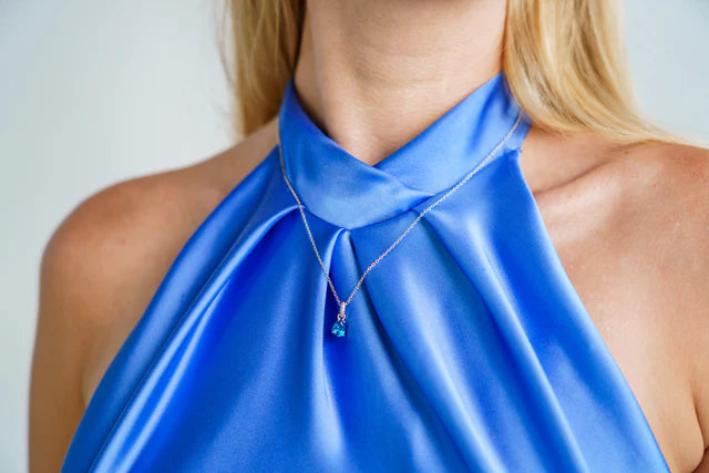 Meticulously crafted from lustrous Rhodium Plated 925 sterling silver, the Georgini Wisteria Pendant draws inspiration from the delicate beauty of nature. The radiant 7 x 5 mm pear-shaped cubic zirconia charm, in this season’s enchanting Blue Topaz hue, evokes the soft curve of a flower petal. Suspended from a pave-set bail that sparkles like tiny blossoms, this pendant hangs gracefully from a 41 cm chain with a 5 cm extension. Perfect for layering or wearing solo, it brings a touch of natural elegance and timeless sophistication to every look