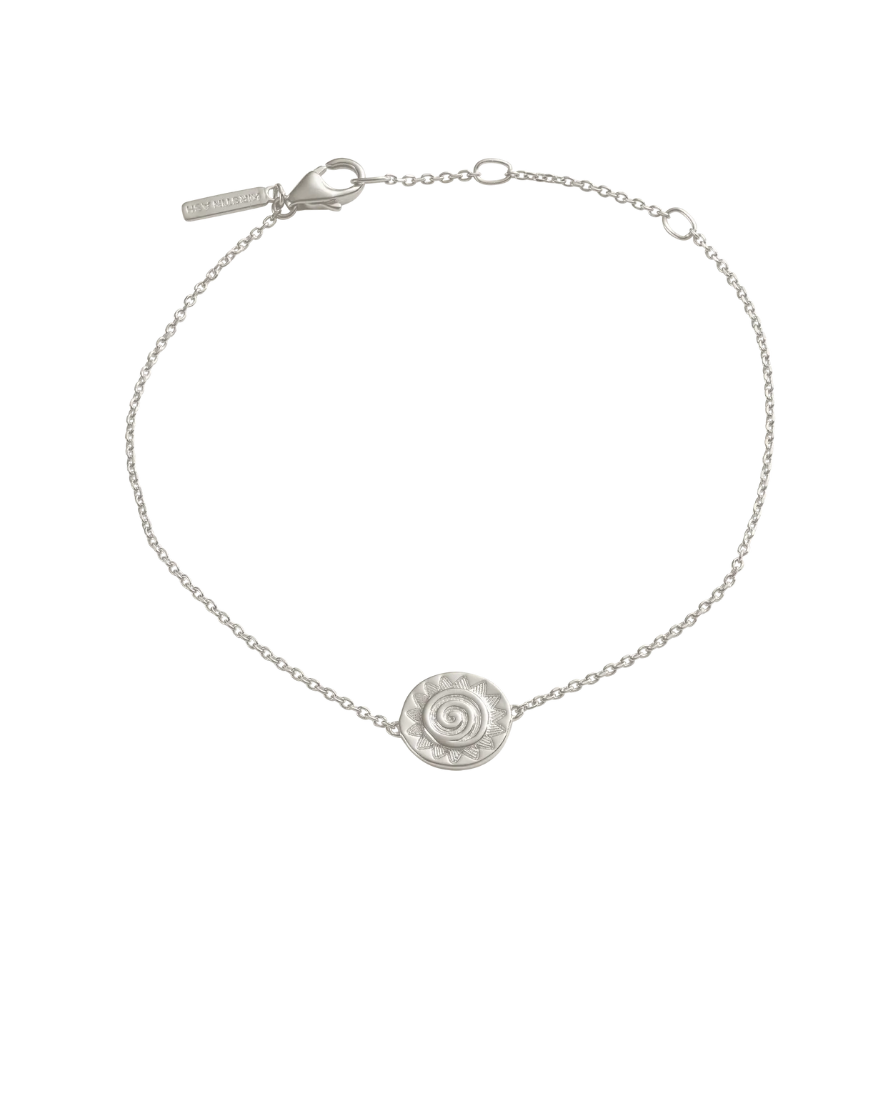 A delicate bracelet crafted in sterling silver, featuring a hand-drawn sun motif suspended at its center. Timeless and luminous, it celebrates the life-giving energy of the sun and the bond between earth and light.