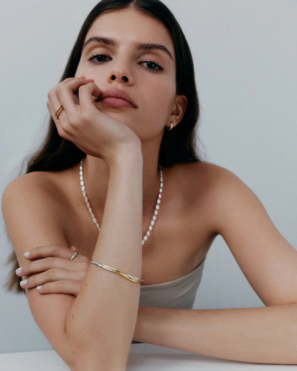 Crafted with interlacing rhodium and 18k gold plated panels, the Halcyon Bracelet is a versatile, everyday piece that complements any style. Its mixed-metal design adds subtle elegance, making it perfect for layering or wearing alone. The Halcyon range embodies the union of opposing energies, creating a harmonious and balanced equilibrium.