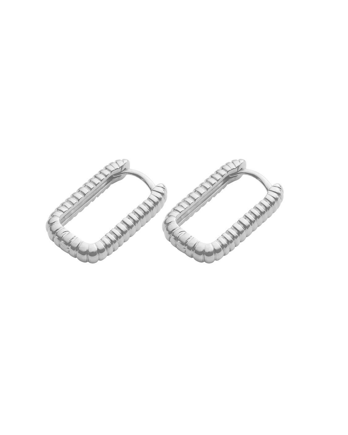 Sculpted with ribbed textures, the Elemental Hoops are a modern take on the classic rectangle drop style. Available in 18k gold plated or silver, their bold silhouette makes them a versatile statement for day or night.