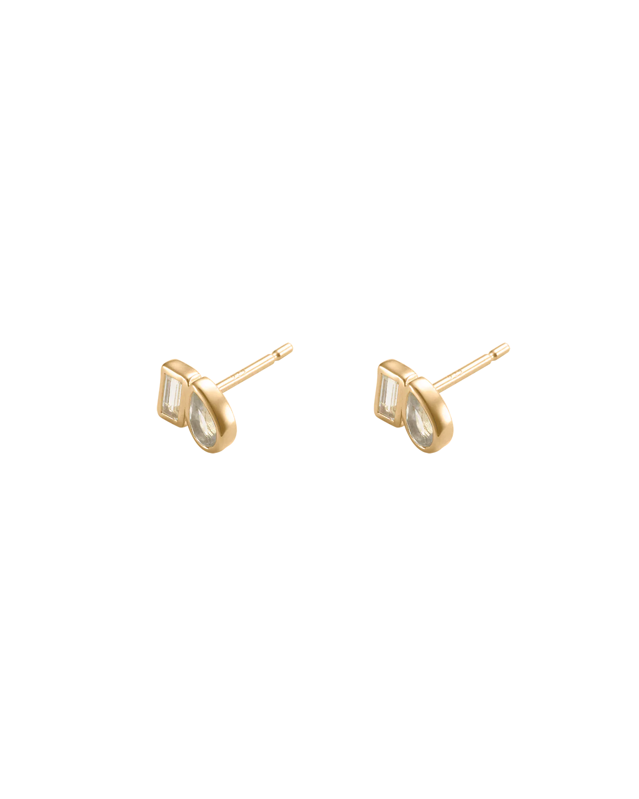 The Place Studs feature two white topaz stones in elegant baguette and pear cuts. Designed to sit delicately against the ear, their minimalist silhouette offers a timeless touch that complements any ear stack. Wear alone for a subtle, refined statement, or layer with other pieces from the Place collection for a curated, sophisticated look.