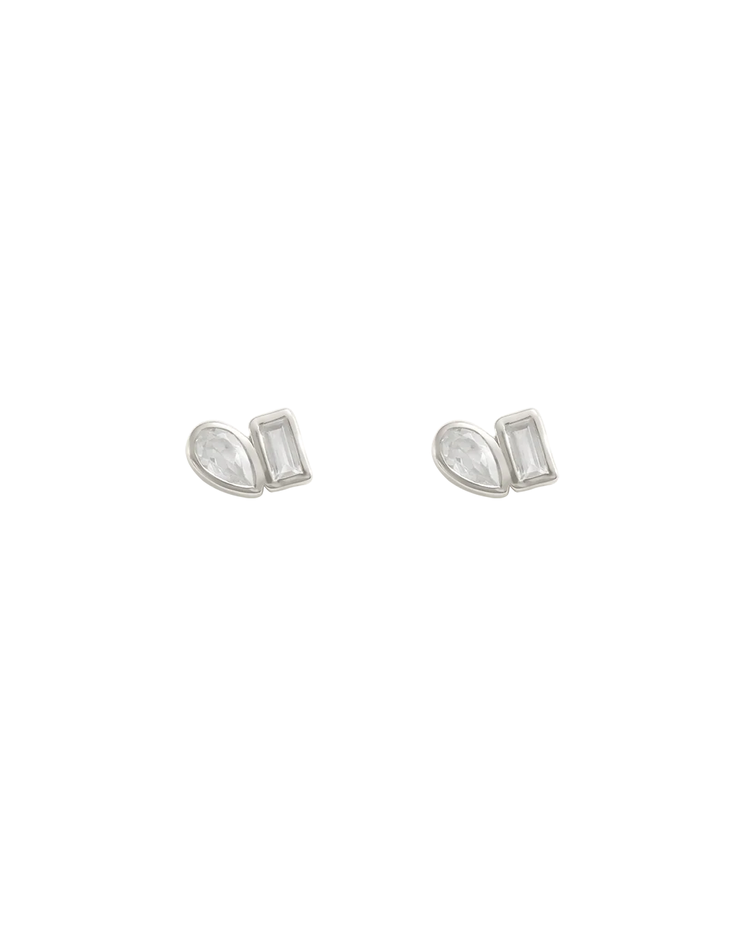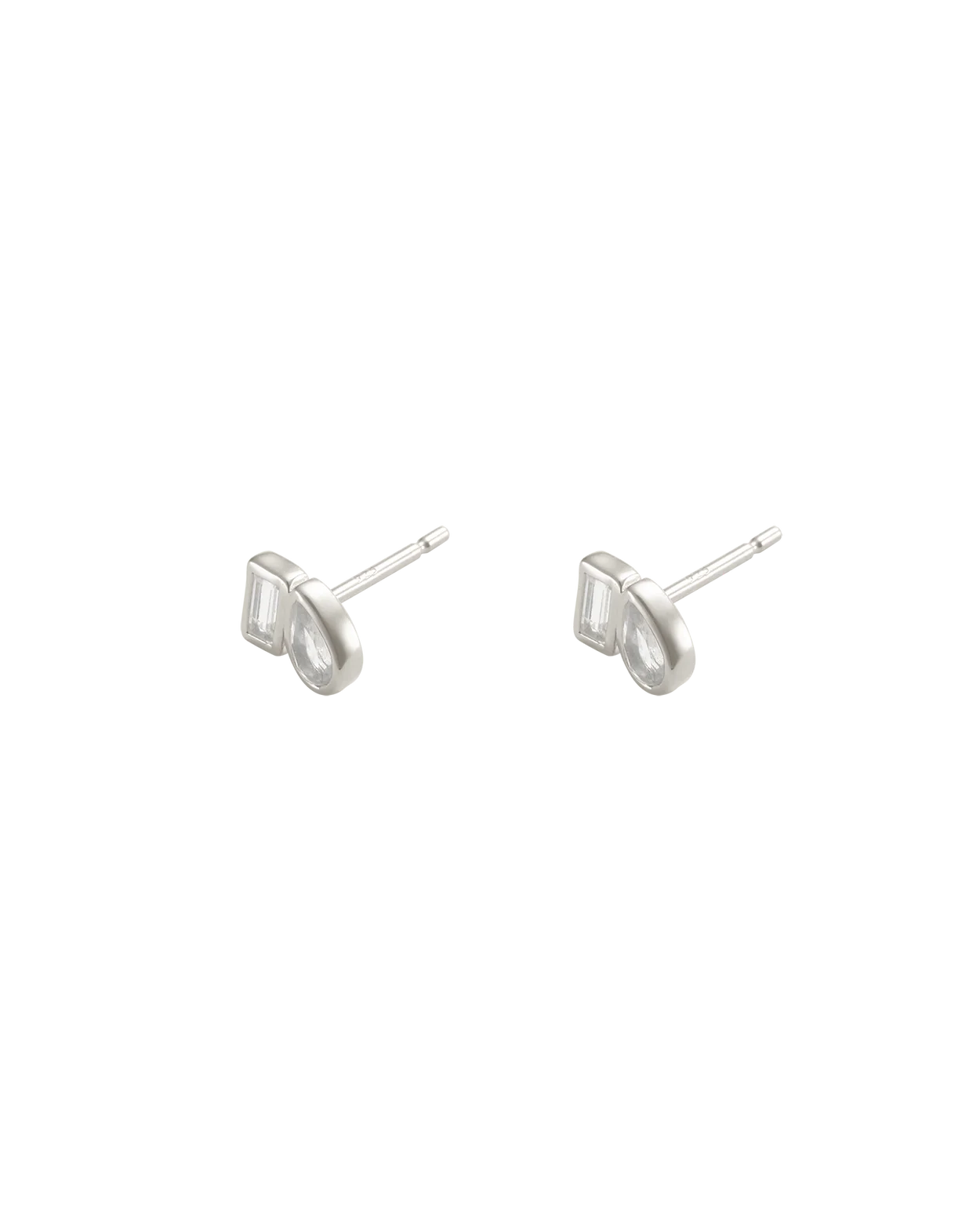 The Place Studs feature two white topaz stones in elegant baguette and pear cuts. Designed to sit delicately against the ear, their minimalist silhouette offers a timeless touch that complements any ear stack. Wear alone for a subtle, refined statement, or layer with other pieces from the Place collection for a curated, sophisticated look.