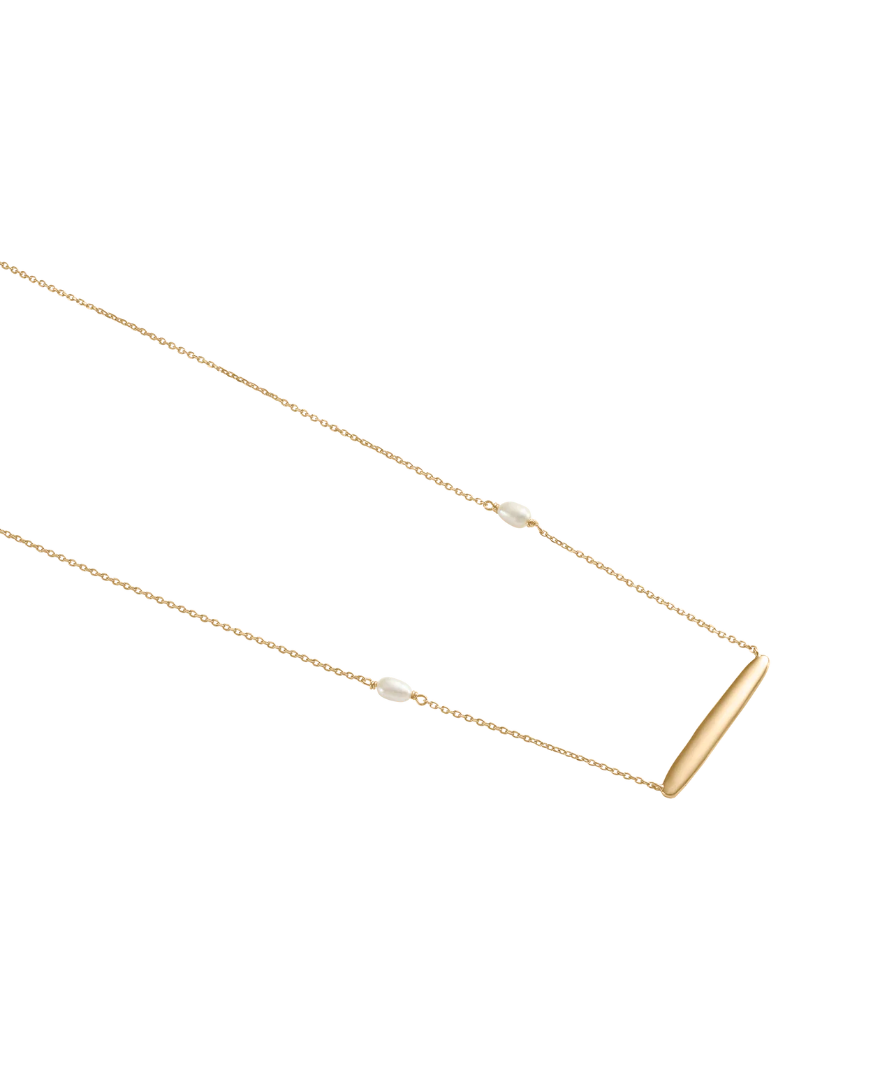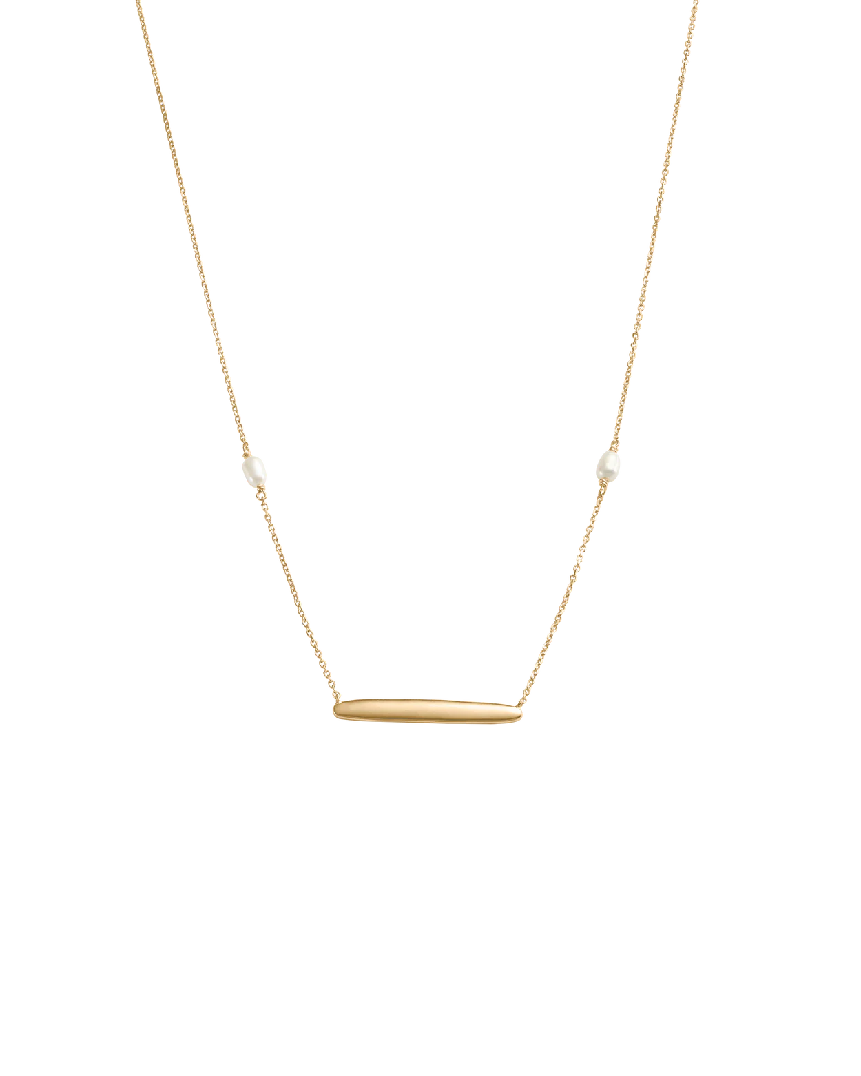 Delicately crafted in 18k gold vermeil, the Maris Engravable Necklace features a refined plate paired with freshwater pearls honouring either side. Its organic form flows gracefully along the neckline, making it perfect for layering or wearing alone as a subtle, elegant touch. Pairs beautifully with the Maris Engravable Bracelet for a curated, meaningful look.