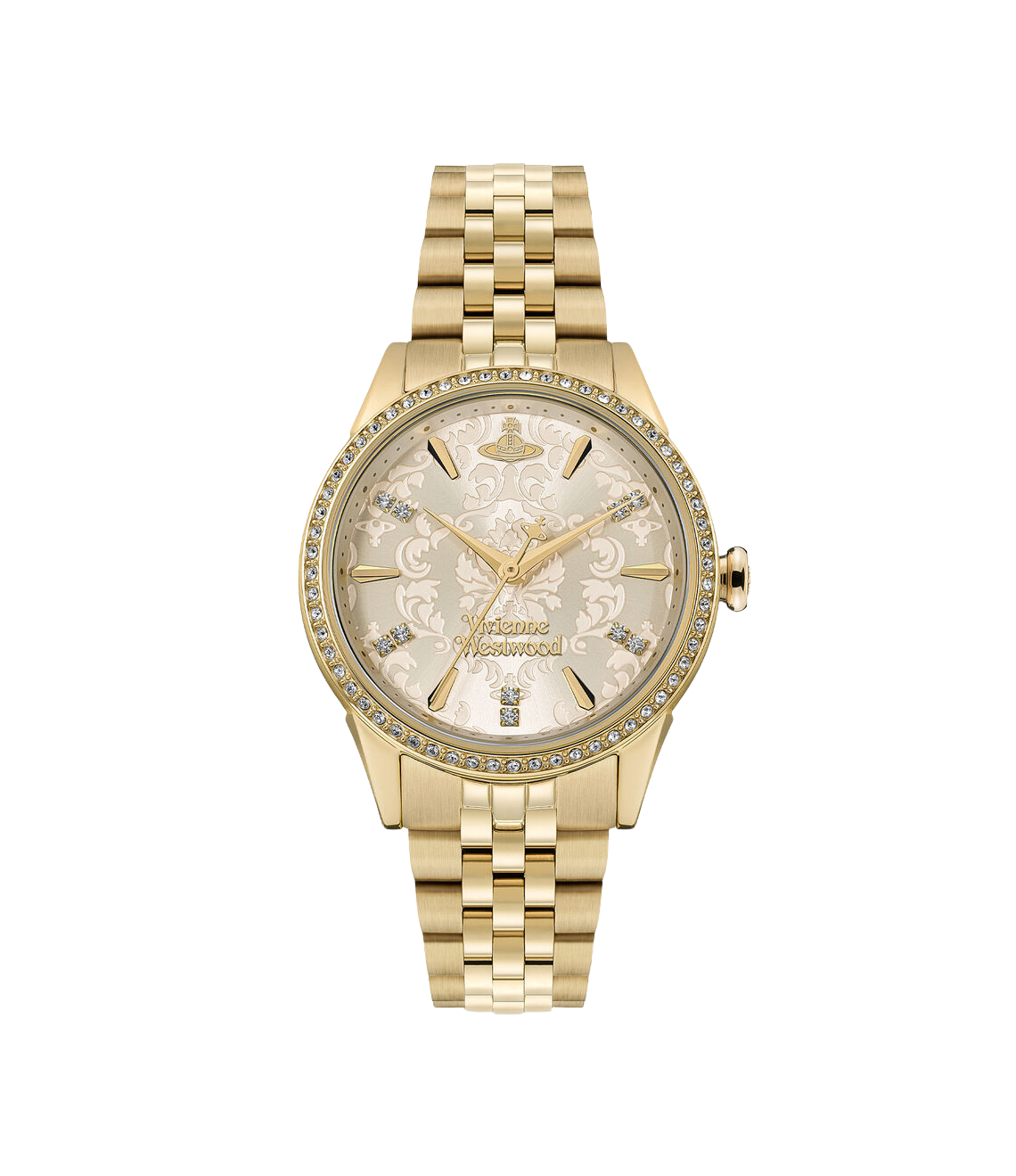 The design of our Little Wallace watch recalls the interiors of the Wallace Collection, complete with a gold-toned metal bracelet, Swarovski crystal details and an intricate jacquard-etched dial. The piece is branded with an orb-adorned second hand and crown, synonymous with Vivienne's vision of launching tradition into the future.