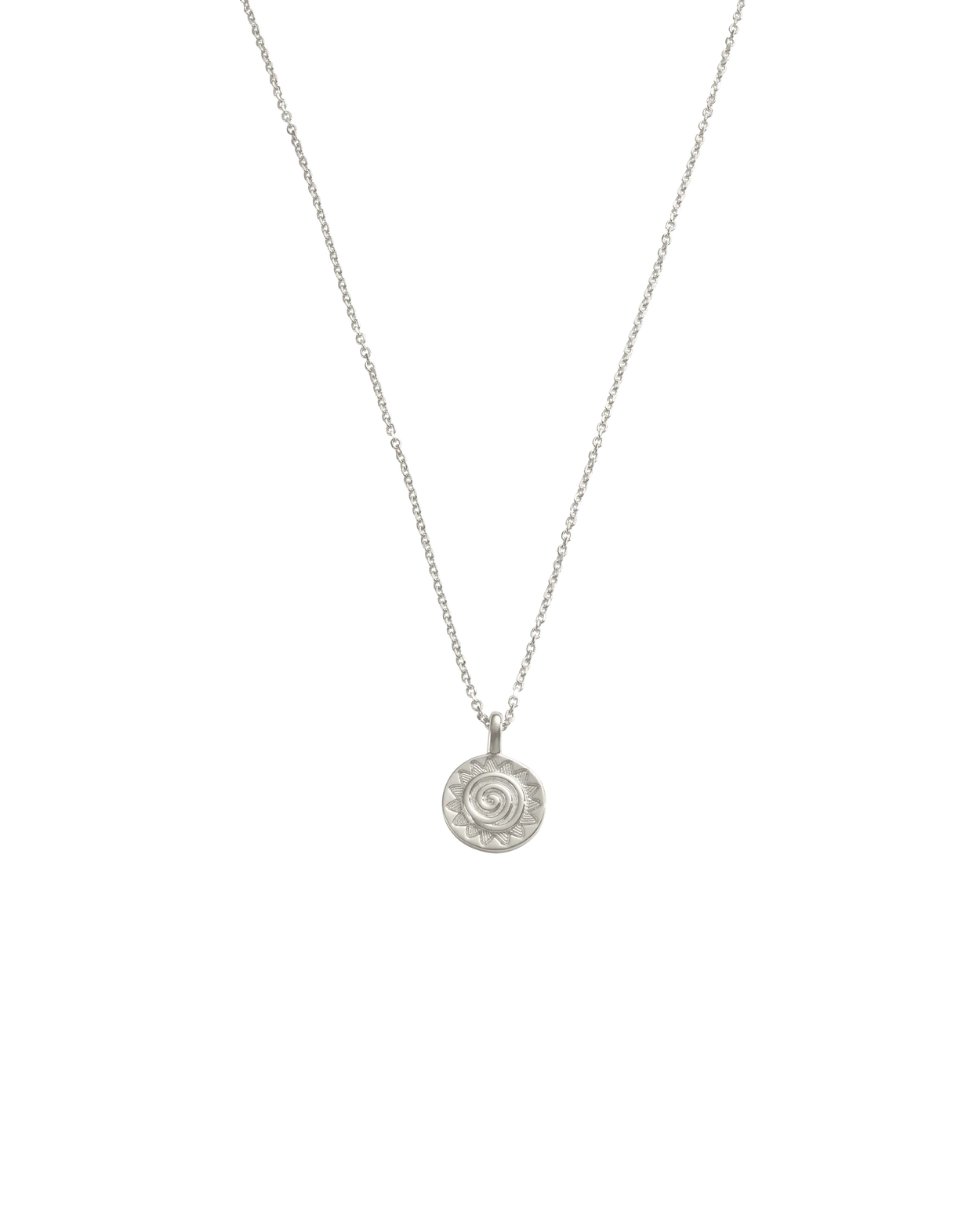 A delicate sterling silver necklace featuring a sun motif suspended at its center. Timeless and luminous, the Solara Coin Necklace honours the sun - a vital force in our natural world - and brings a radiant, meaningful accent to everyday wear.