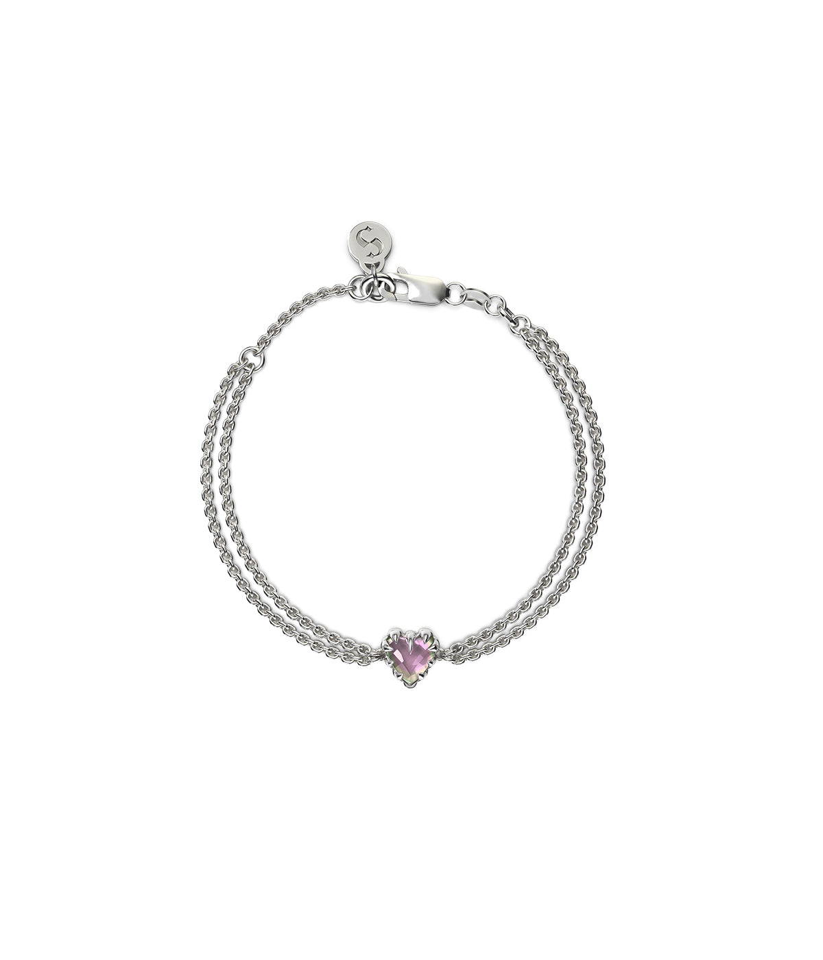 Sculptural claw settings surround the heart stone, forming a protective frame that emphasizes brilliance while highlighting the architectural detail of the design. Crafted from solid sterling silver, the bracelet’s double-chain construction creates a delicate yet structured silhouette around the wrist.
