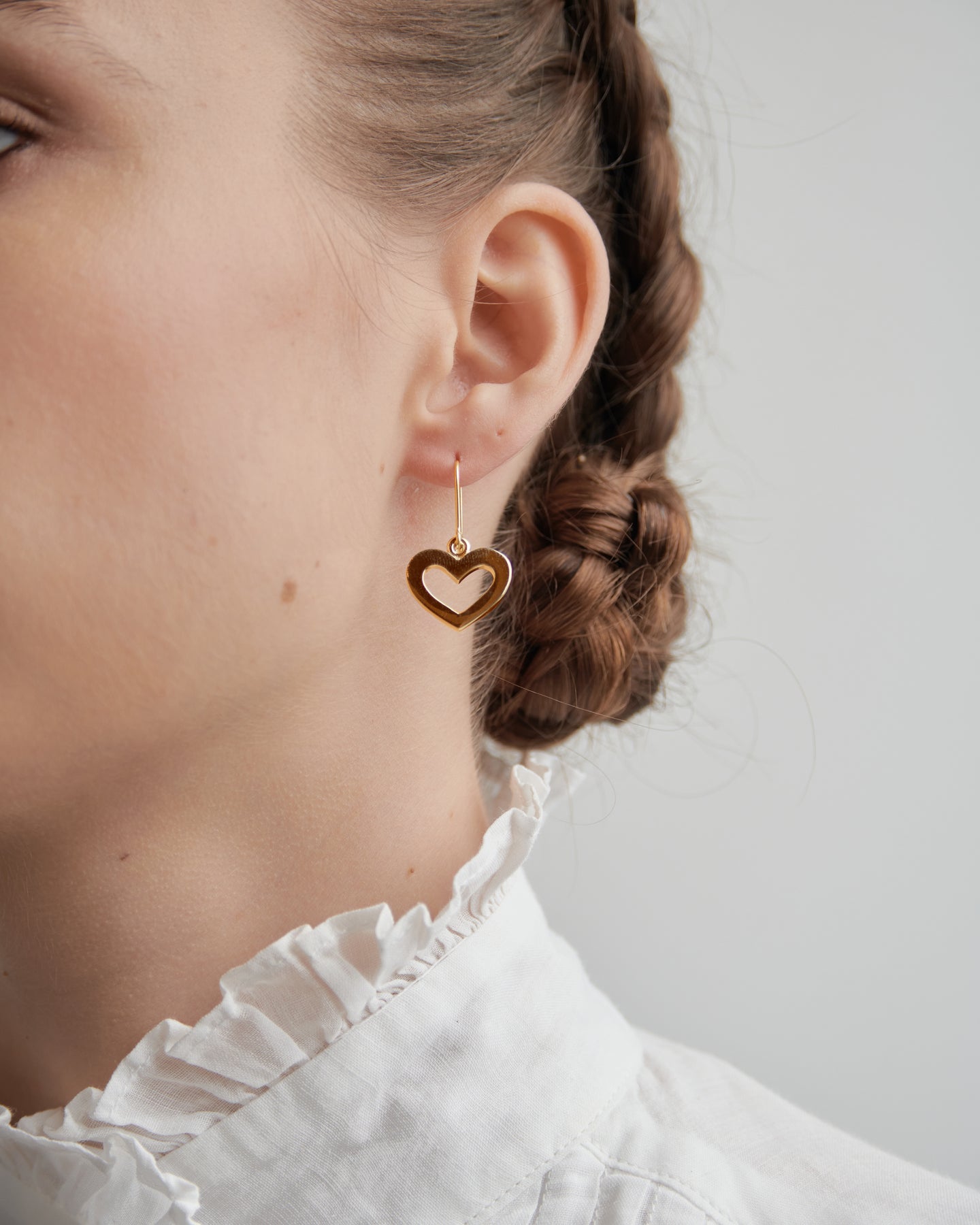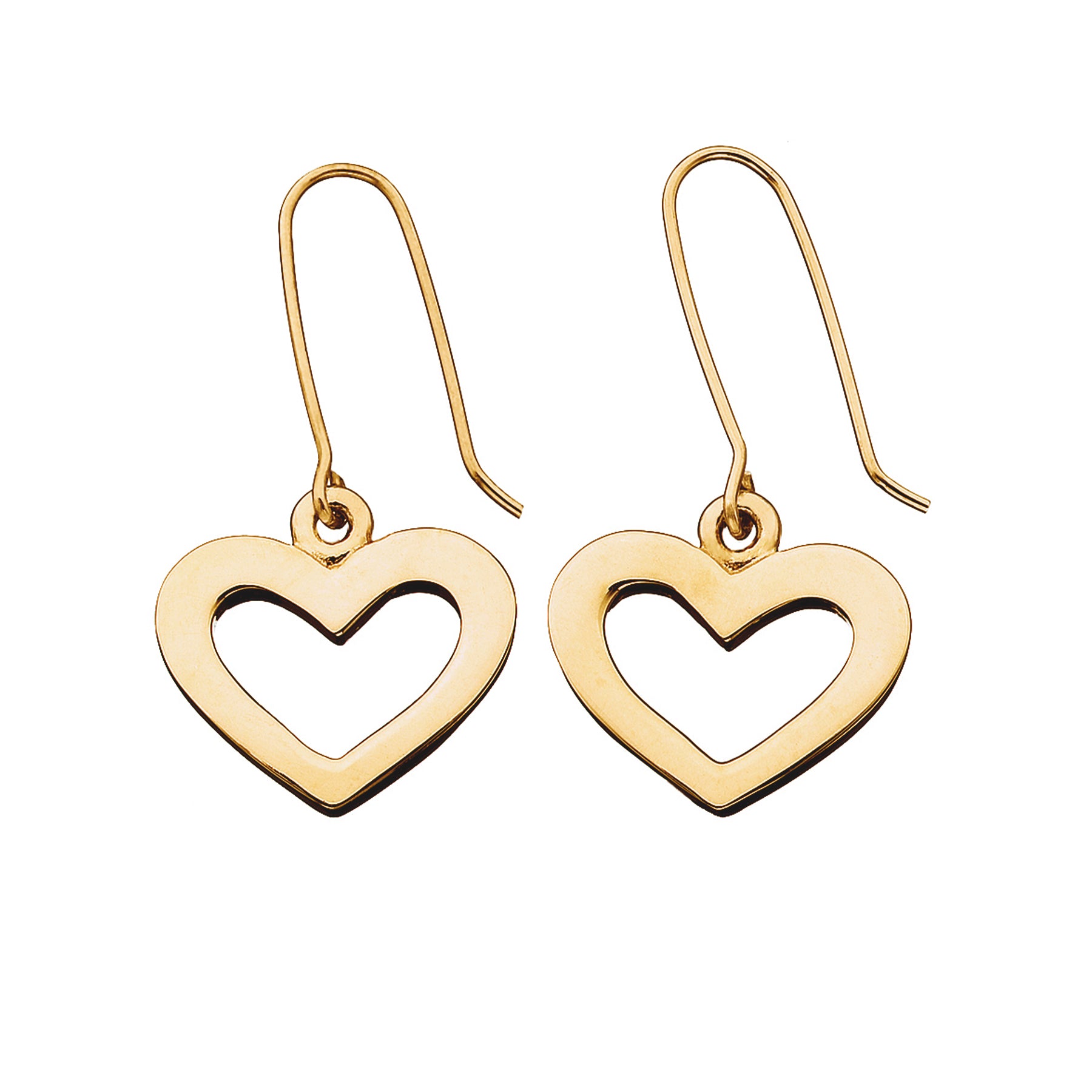 Cast in glistening sterling silver and electroplated in with 2 microns of 14ct yellow gold , a pair of hearts, long-held symbols of love, dangle from a pair of earring hooks to create the classic Karen Walker Heart Earrings.