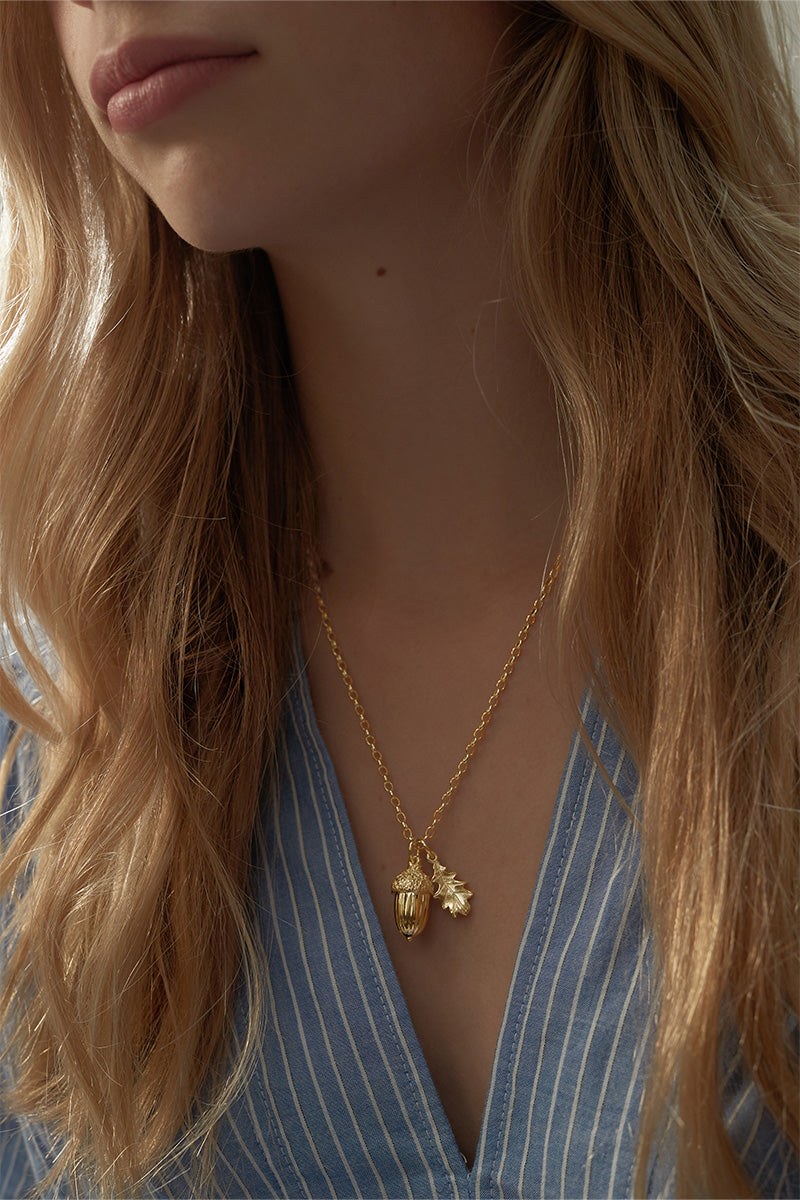 Infused with woodland magic, the Hard Gold Plate Acorn & Leaf Pendant is a Karen Walker classic. Featuring a life-size acorn, complete with roughcast oak leaf, ready to be suspended from a chain of your choosing and be worn as an emblem of strength and good luck.