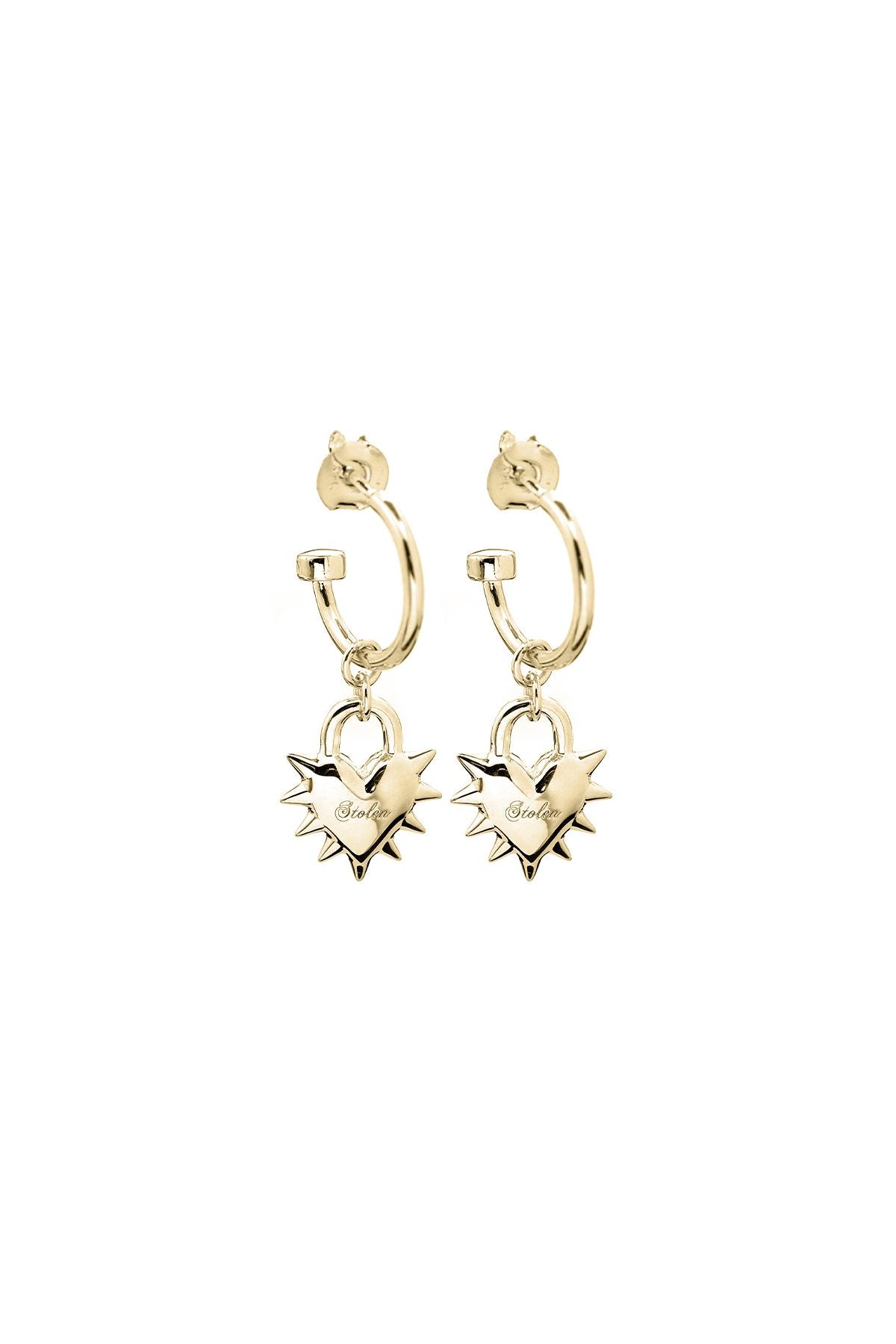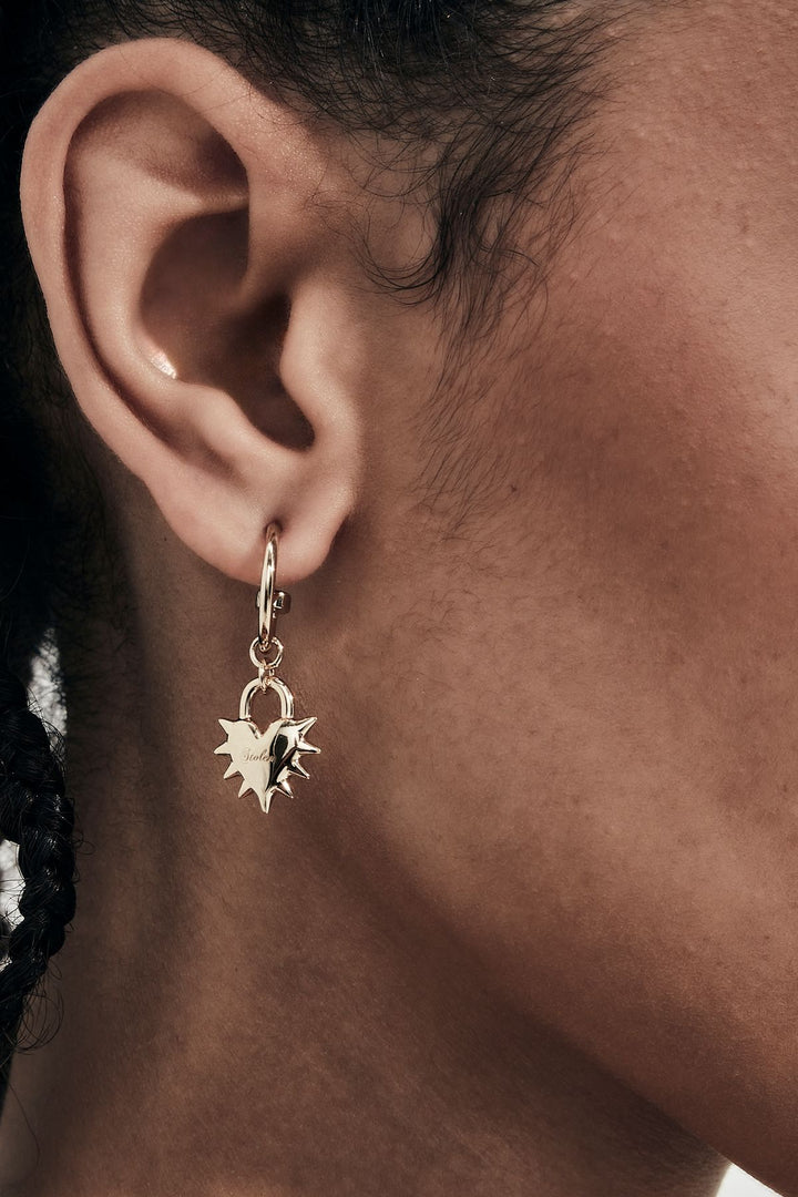 A traditional heirloom, modernised through a lens of punk romanticism - this isn’t your grandmother’s locket. This puff heart charm reimagined into a sacred padlock, adorned with sharp spikes - guardians to their wearer. Detailed with elegant script and a hidden keyhole, suspended on anchor hoops - crafted from solid sterling silver and coated in 18kt gold plating.