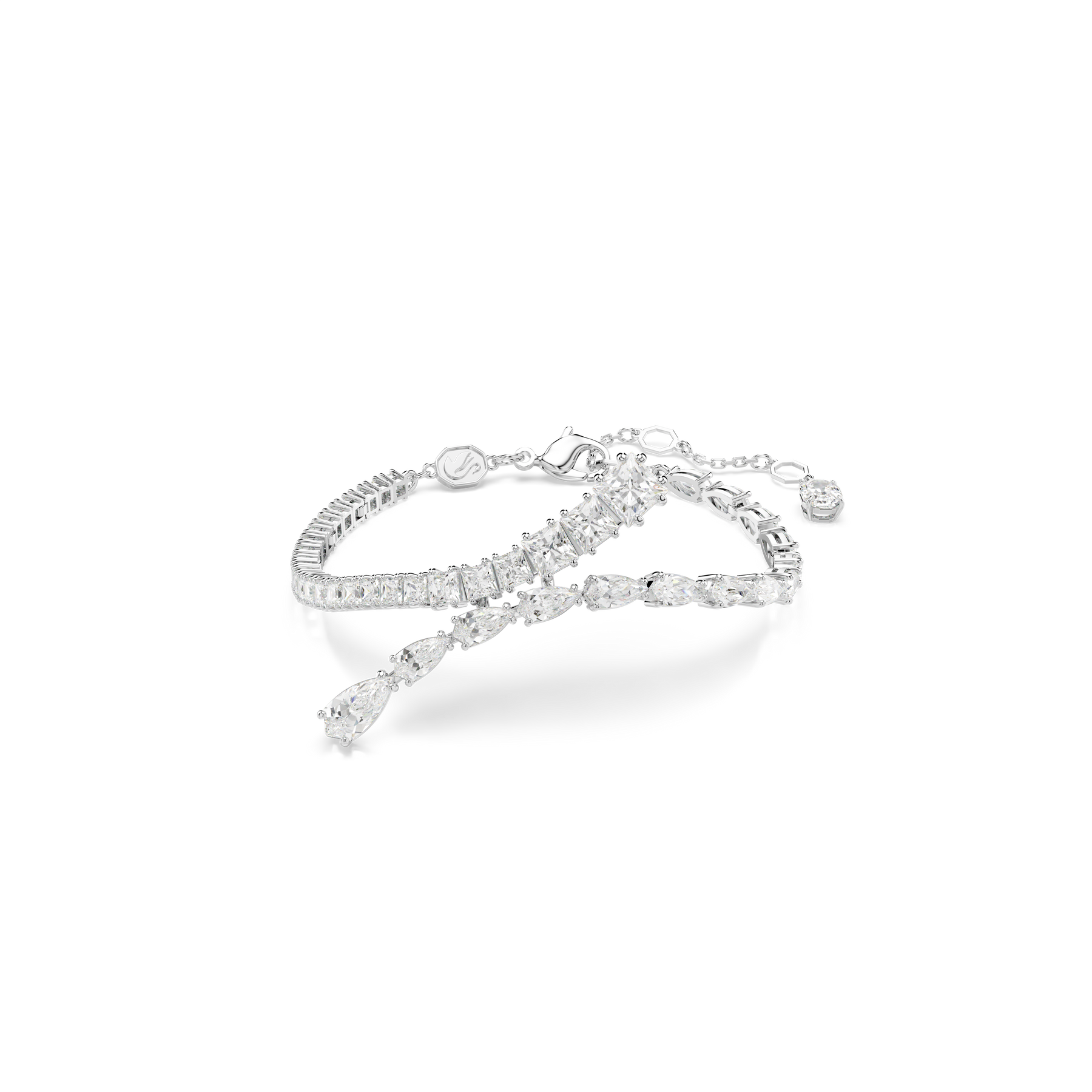 Enhance any outfit with the exquisite radiance of this Matrix bracelet. The rhodium plated design is adorned with an array of clear Swarovski Zirconia and crystals in pear and square cuts, with multiple sizes adding unexpected dimensions to the silhouette. A lobster closure ensures an easy fit. Pair this bracelet with pieces from the same family for a joyfully extravagant look.