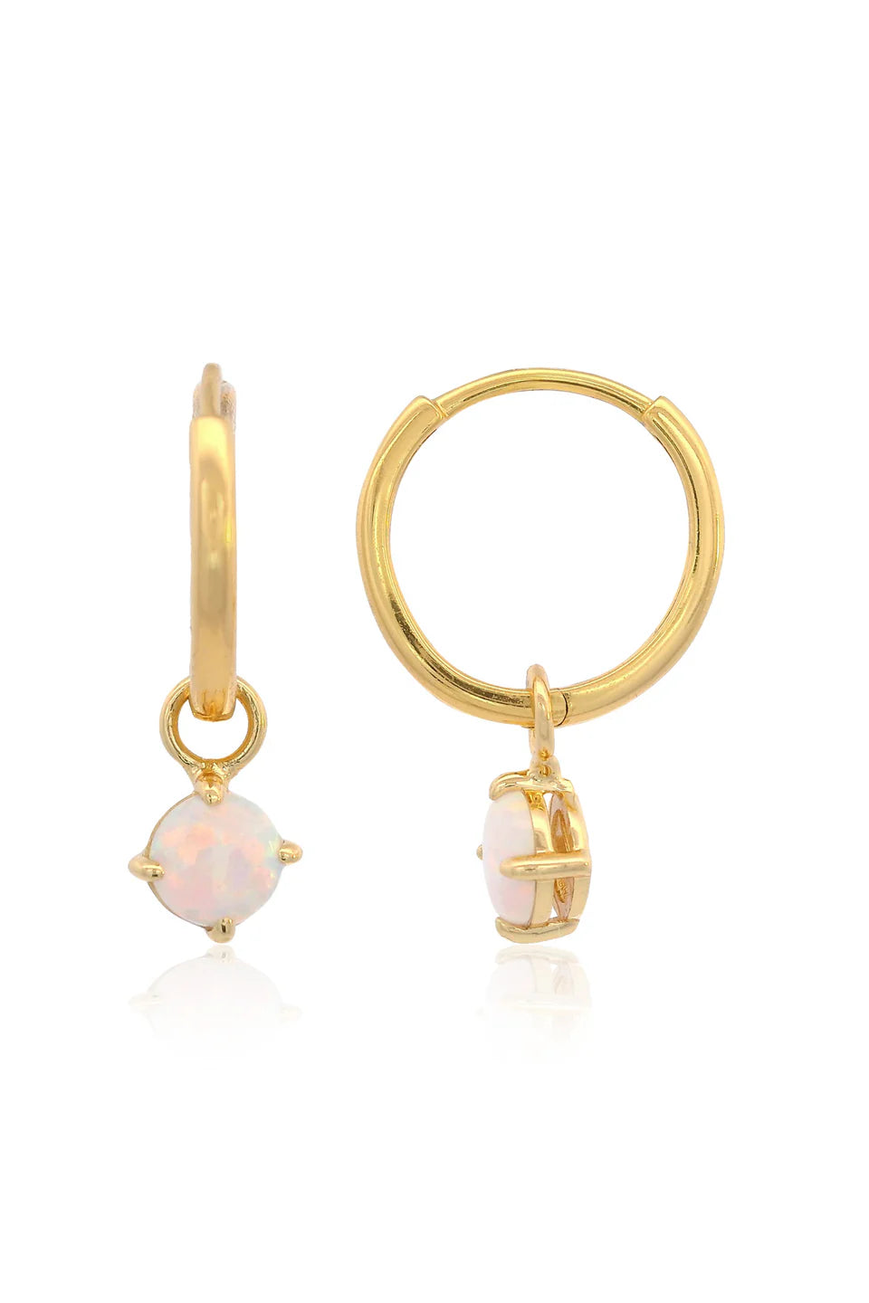 Elegant, versatile, and effortlessly luminous — the Georgini Wisteria Dangle Hoops are the perfect way to add a touch of opalescent beauty to your everyday look. Crafted from luxurious 18ct gold e-coated 925 sterling silver, these 13mm hoops feature a removable 5mm created opal charm that dances delicately with every movement.