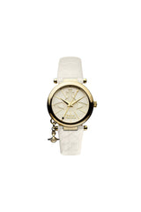 Ladies Vivienne Westwood Orb II model in a sleek design featuring a PVD gold-plated case hung with a stylish gold orb charm. This model features a white dial with gold orb motif, gold hour markers and gold hands. This watch fastens with a stylish white textured leather strap and is powered by a quality Swiss Quartz movement.