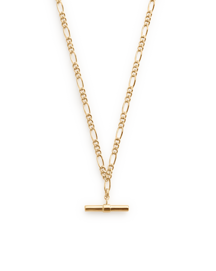 A modern take on a timeless classic, the Rhythm T-Bar Necklace features a 3mm Figaro chain; an enduring vintage-inspired design that adds depth and character. A sleek horizontal bar anchors the design, making a refined yet bold statement. Striking on its own and effortlessly layerable, this necklace moves between everyday wear and elevated styling with ease.